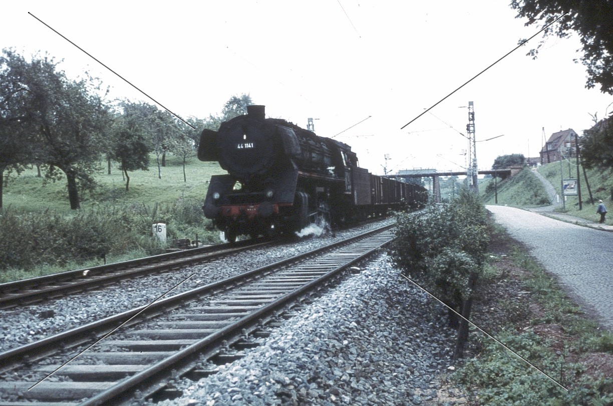 Das Bild zeigt die: Dampf-Güterzuglokomotive 44 1141 der DB vor Gem-Güterzug bei Heldenbergen-Windecken - 1960