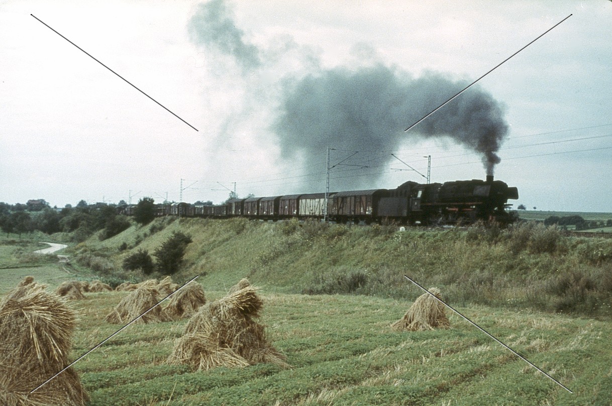 Das Bild zeigt die: Dampf-Güterzuglokomotive BR 44 der DB vor Gem-Güterzug bei Bruchköbel - 1960