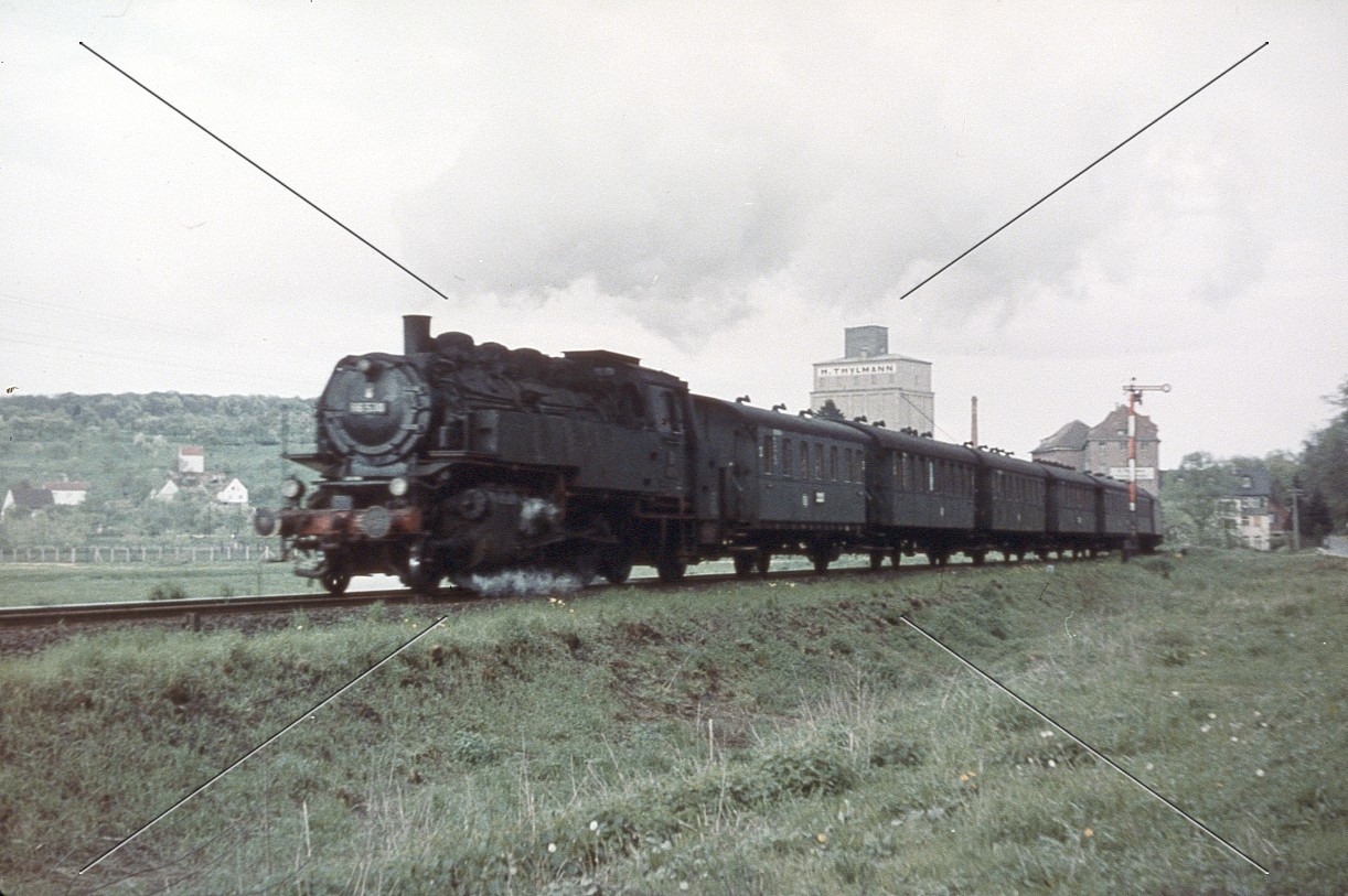 Das Bild zeigt die: Dampf-Tenderlokomotive BR 64 der DB vor Personenzug bei Kilianstädten/Oberhessen - 1959
