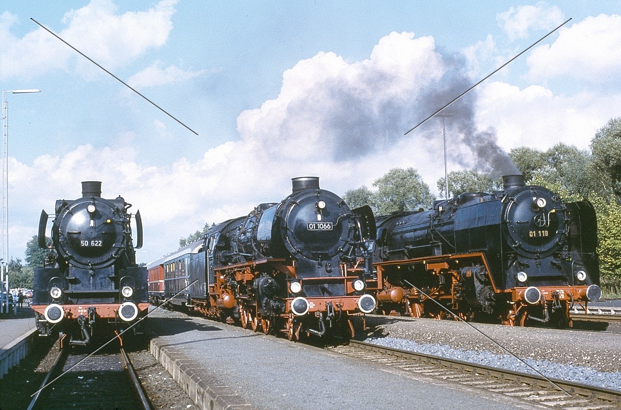 Das Bild zeigt die: Lokomotiv-Parade im Bhf. Schnabelwaid/Opf. - DB mit Lokomotiven: 50 622 - 01 1066 - 01 118 im Sept. 1985